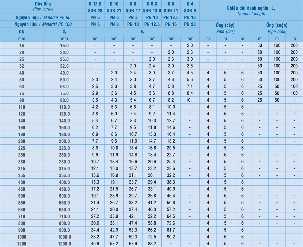 Ống nhựa HDPE có đường kính từ D20 đến D600, phân bổ theo độ dày và áp suất nước khác nhau tùy theo nhu cầu sử dụng của công trình tương ứng với các phụ kiện đi kèm.