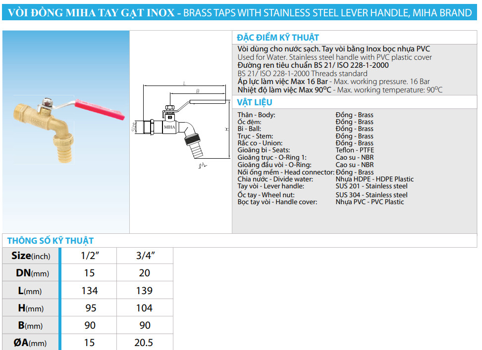- Van bi tay gạt đồng Miha nối ren có tuổi thọ cao, có nhiều kích thước, dễ dàng tìm mua và thay thế sau này.